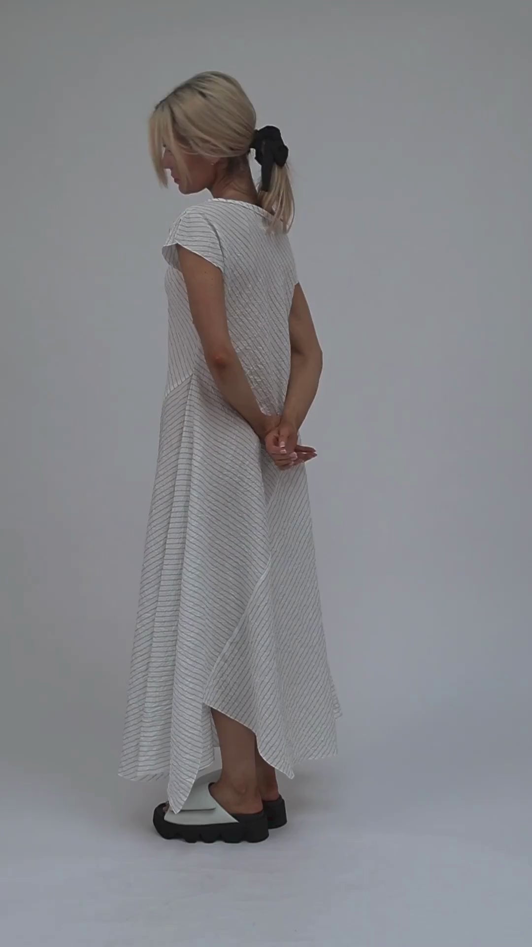 The HAKU Dress In White with black thin stripe From Xenia Design is crafted from the most beautiful crepe style material that is lightweight and floats magically when moving as its flowing skirts has subtle pleating. With its rounded v neckline and slight cap sleeve. Made in Croatia from. premium quality fabrics this dress is easily paired with sandals, sneakers and more.