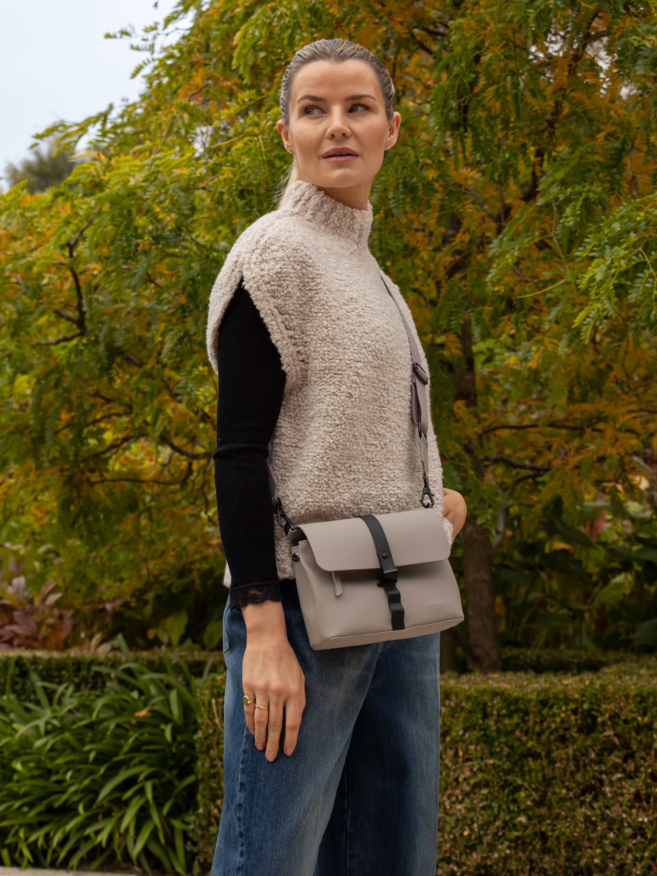 The Boucle Vest from Jane Lushka is a modern layering piece with a soft bouclé texture in versatile black.