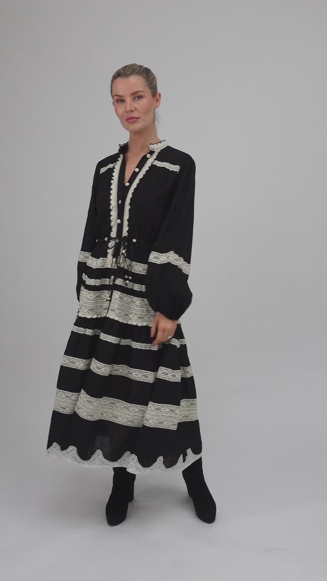 A modern take on bohemian style, the Delphine Dress blends rustic charm with contemporary elegance. Crafted from heavy 100% cotton, it features tiers of delicate cream crochet embroidery for a beautifully textured finish. The dress buttons from the mandarin collar to the hemline and includes a black stretch slip for comfort and coverage.