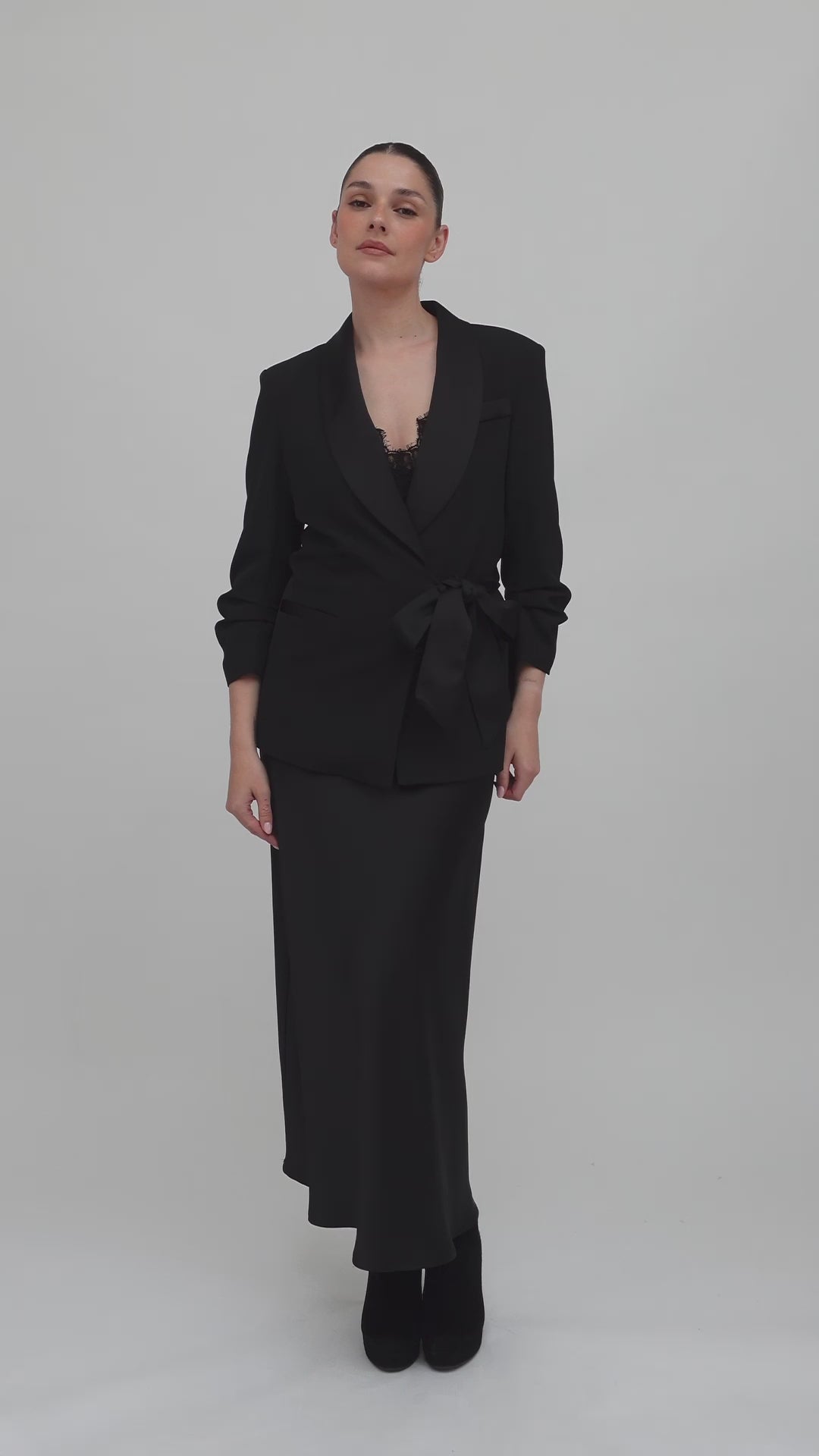 A sleek satin silhouette with delicate lace detailing at the deep V-neckline and slim shoulder straps. Designed to move beautifully with the body, this piece brings effortless elegance to evening dressing. Understated yet striking, it’s perfect worn solo or layered under the matching blazer for modern sophistication.
