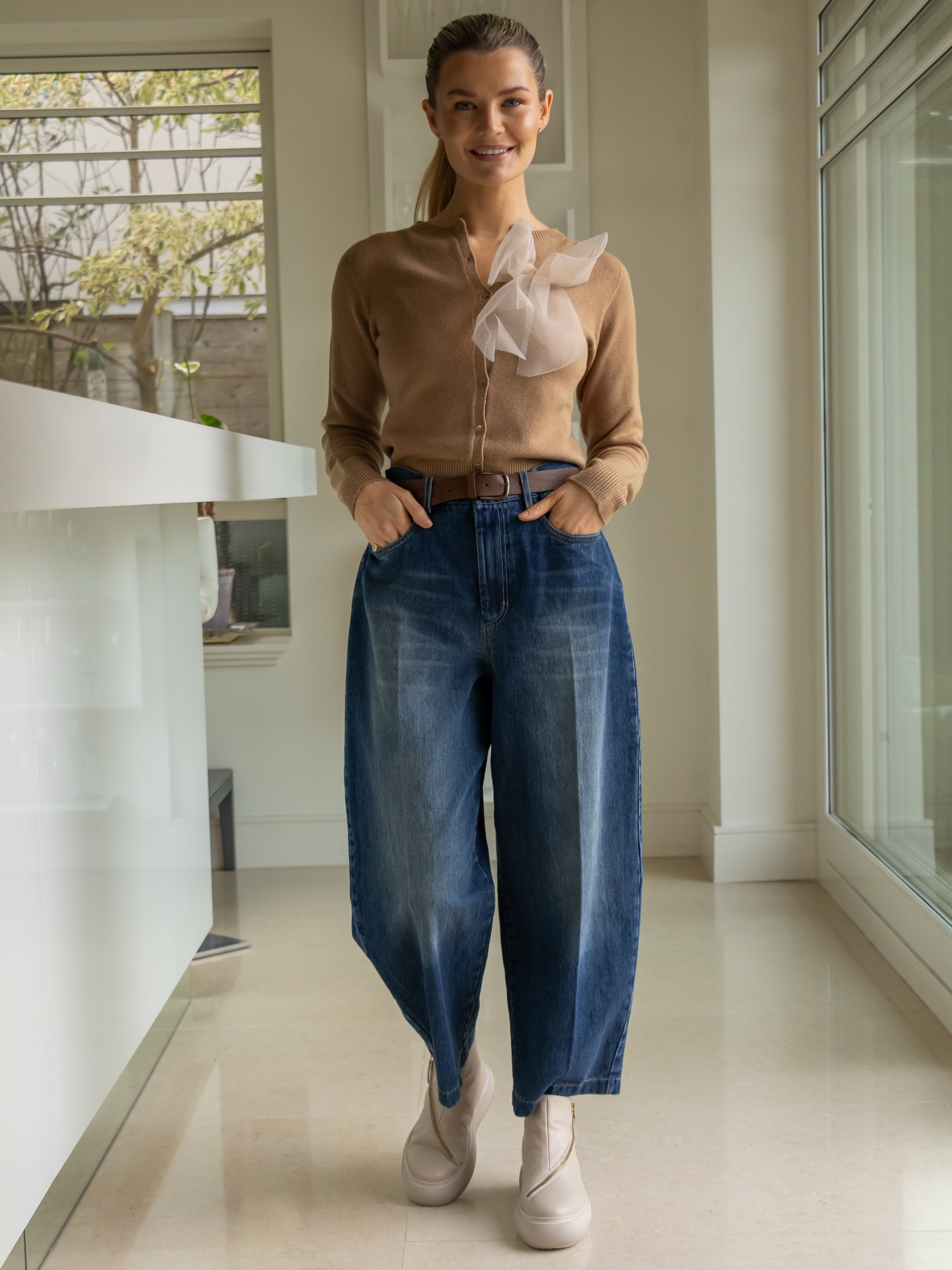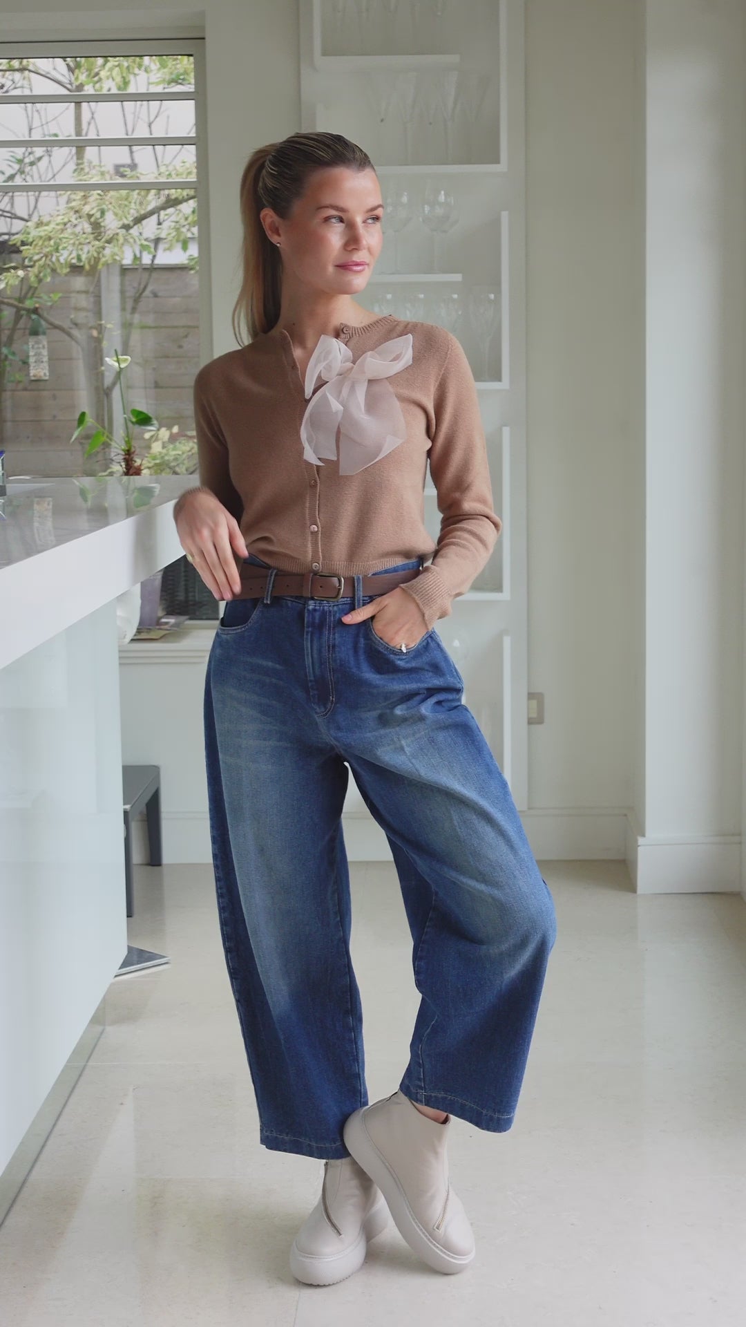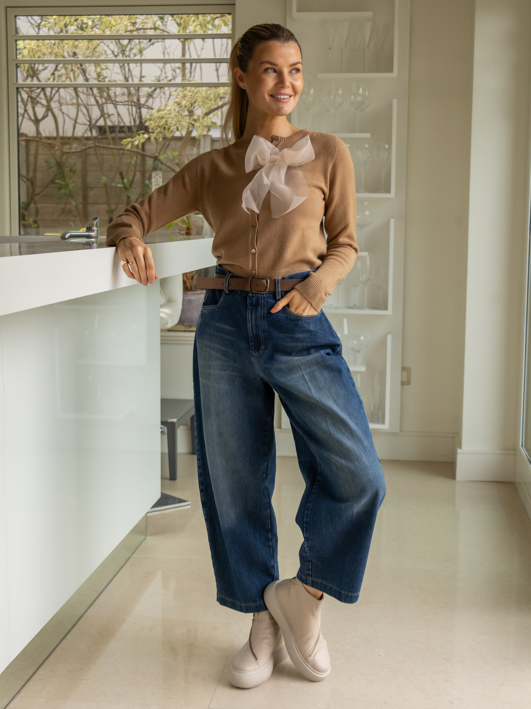 A feminine twist on a timeless classic. The Beau Cardigan features a detachable organza bow that adds a soft, romantic touch to this beautifully simple knit. Designed in a flattering one-size fit, it drapes effortlessly for a polished yet relaxed look — perfect for elevating everyday denim or pairing with tailored separates.