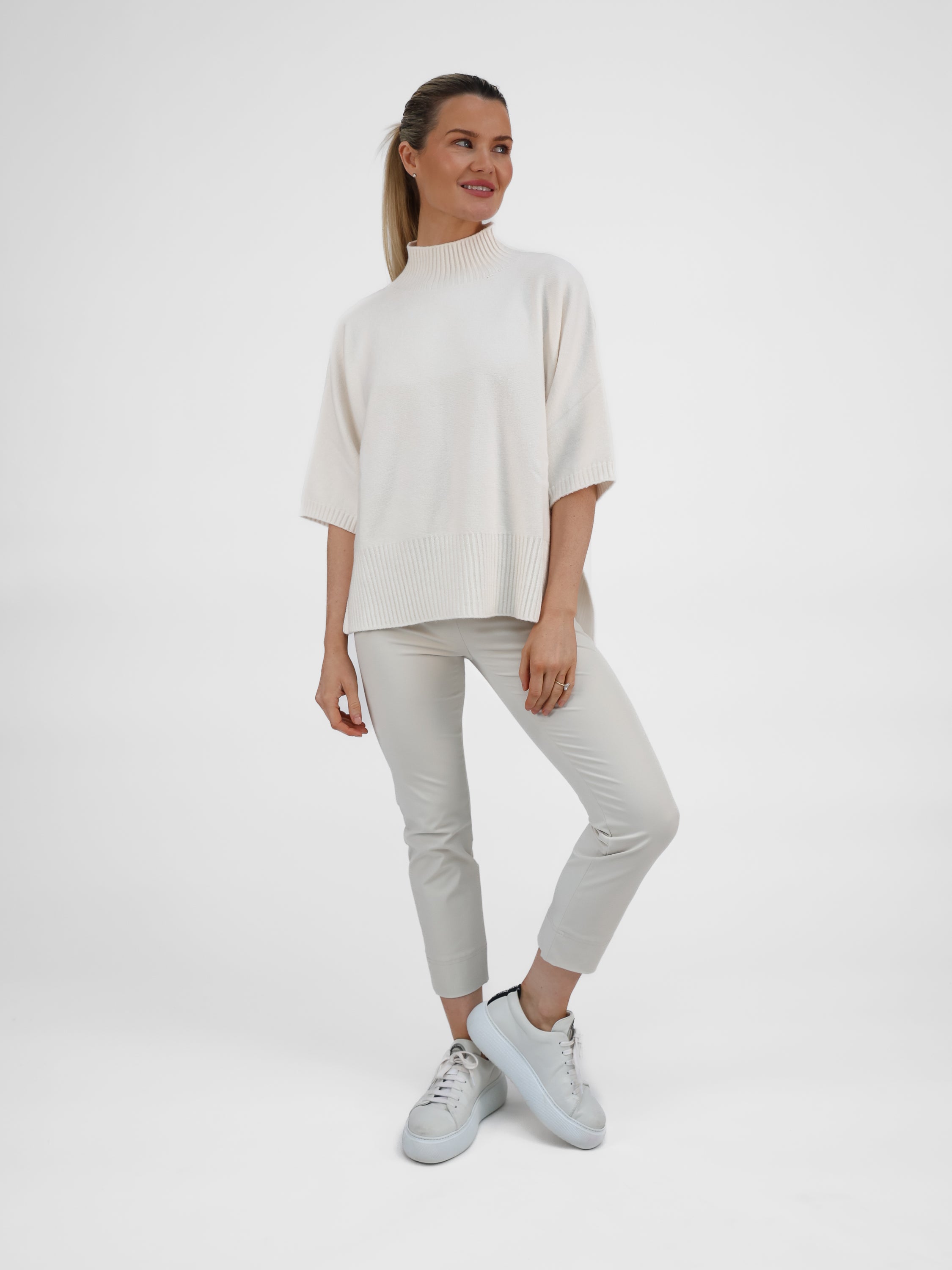 The Josep Dip Back is a modern twist on a classic knit, designed in a soft Winter White shade. Cut with a relaxed fit, it features a high ribbed neckline and 3/4 length sleeves with dramatic ribbed cuffs.