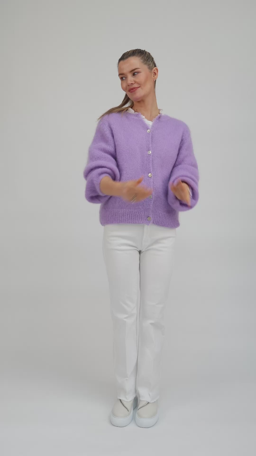 Soft, airy and effortlessly elegant, this Italian-made mohair cardigan is your perfect light layer. Designed in a relaxed fit, it features subtle balloon sleeves, delicate flat pearl-like buttons, and fine ribbing at the cuffs and hem for a polished finish. The soft lilac hue adds a gentle, romantic touch to your wardrobe, bringing a subtle pop of colour that feels both fresh and elegant.