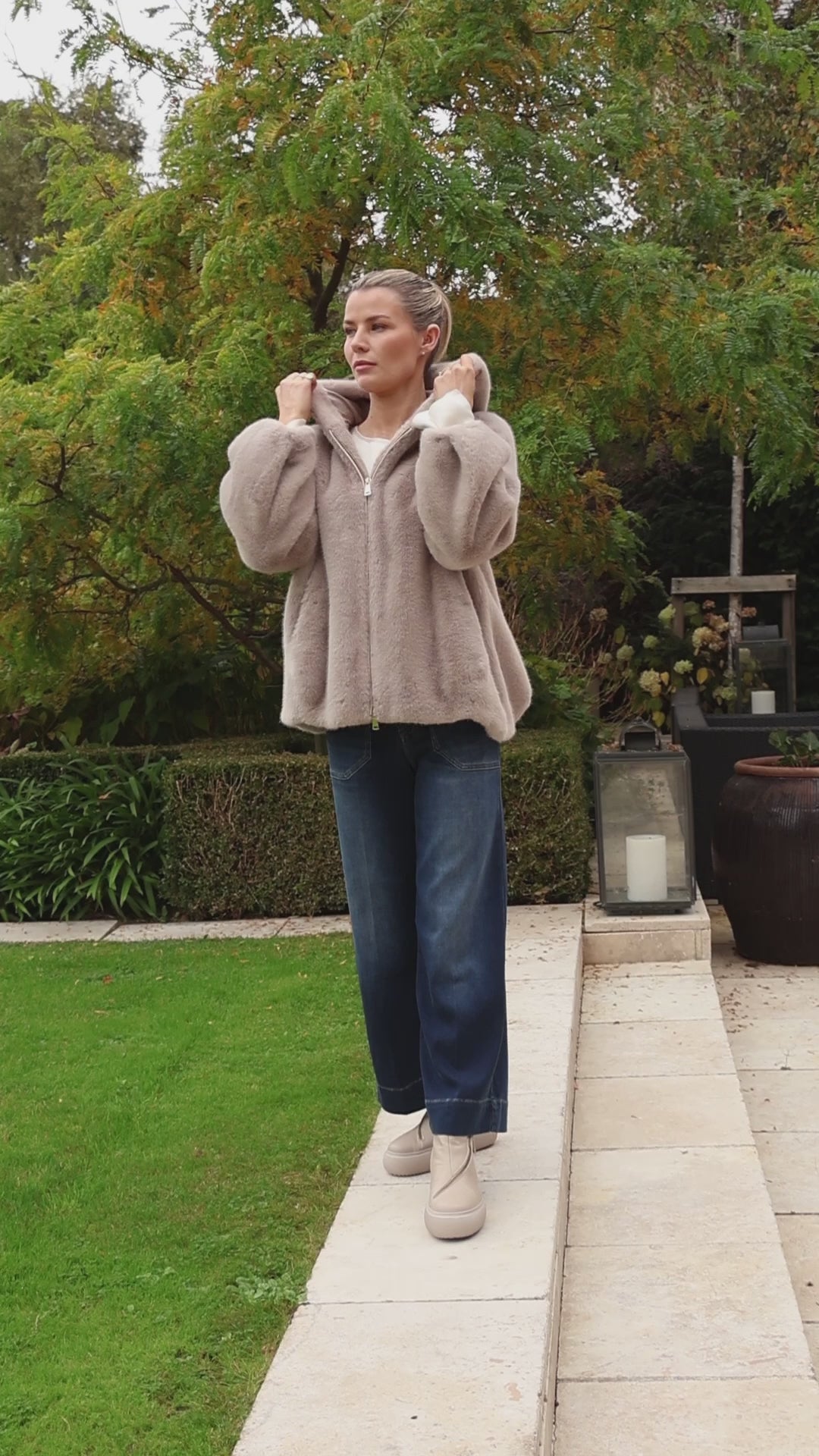 Chic, cozy, and effortlessly elevated — this faux fur hoodie in rich dark taupe is the ultimate statement in winter comfort. Designed with soft bell sleeves, a voluminous hem, and an oversized hood, it blends luxury with ease. The two-way gold zip and side pockets add both function and polish, while the fully lined interior ensures warmth without bulk.