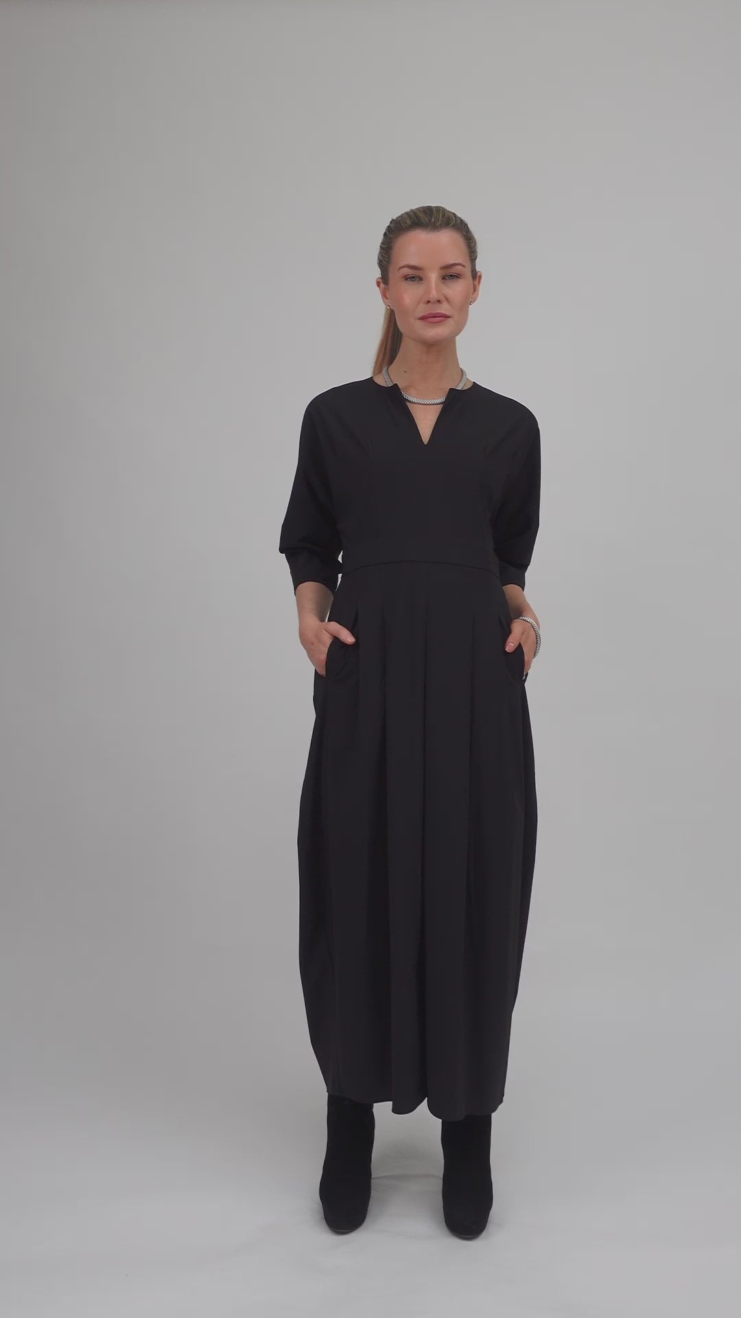 A timeless piece with refined simplicity, the Gaara Dress features a structured silhouette enhanced by a soft technical jersey. With a V-neckline and 3/4-length sleeves, it flatters the figure while offering all-day comfort. The midi-length skirt with subtle pleats and an accentuated waistband creates a polished, feminine look — ideal for work or special occasions.