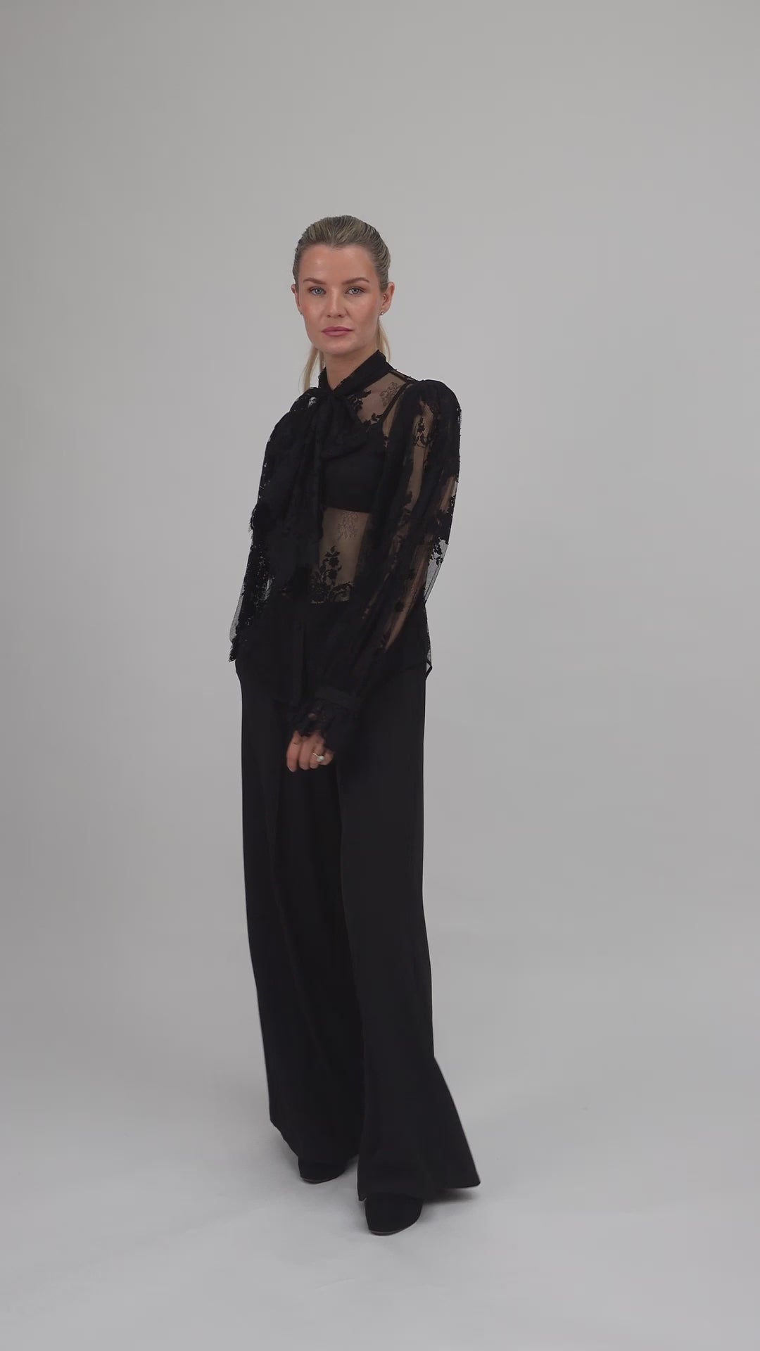 Romantic yet modern, this sheer lace shirt adds instant sophistication to any look. Designed in delicate black lace with softly puffed sleeves and tie cuffs, it features a statement bow neckline and button-through front. The fluid silhouette makes it perfect for tucking into tailored trousers or skirts for an elegant evening look.