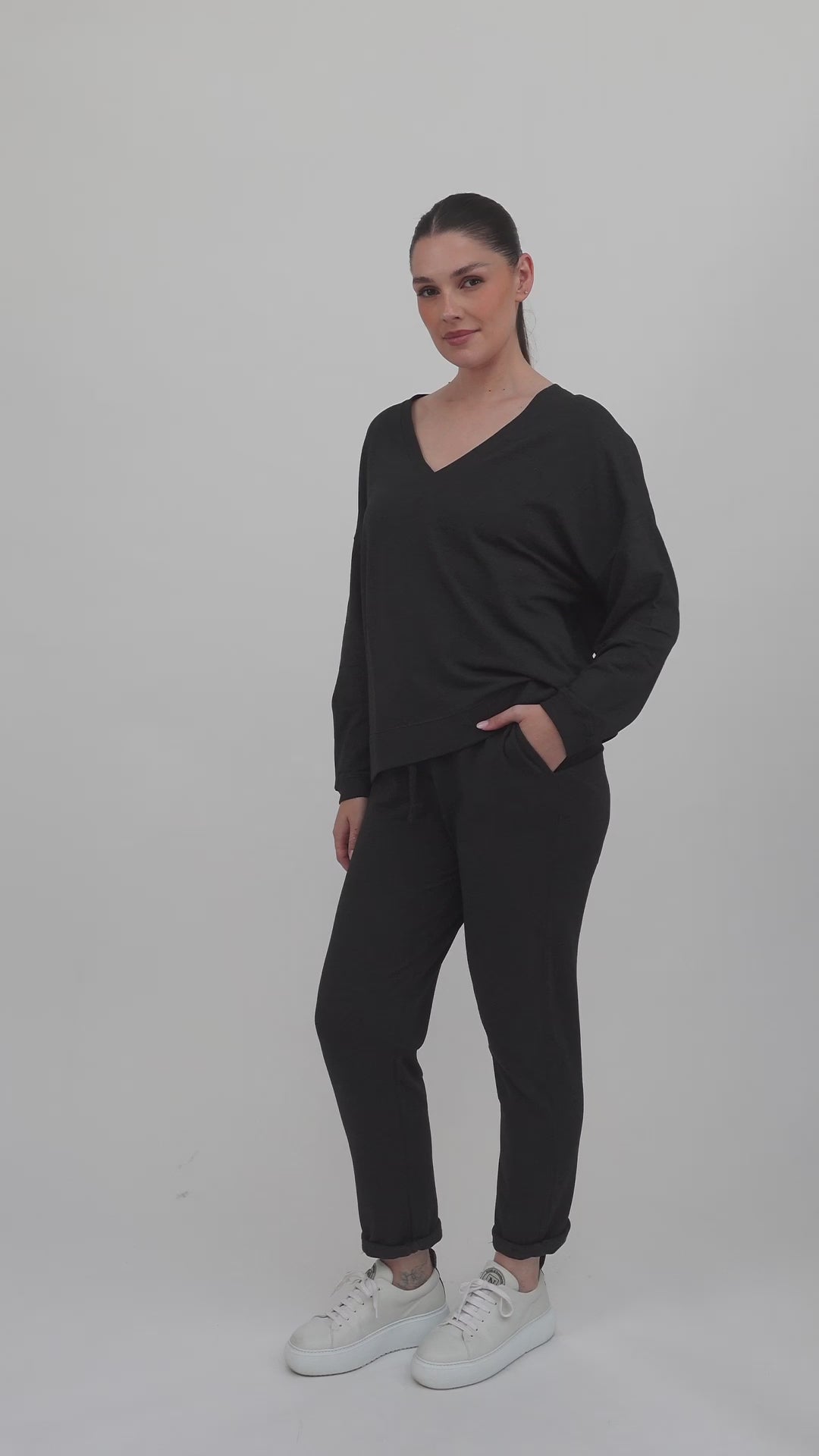 An easy, oversized V-neck sweatshirt crafted in Majestic Filatures’ signature soft stretch jersey. Designed with a relaxed silhouette, long sleeves, and double rib detailing at the hem and cuffs, it offers understated luxury with everyday comfort. Perfect for layering or wearing as a stand-alone statement of effortless style.