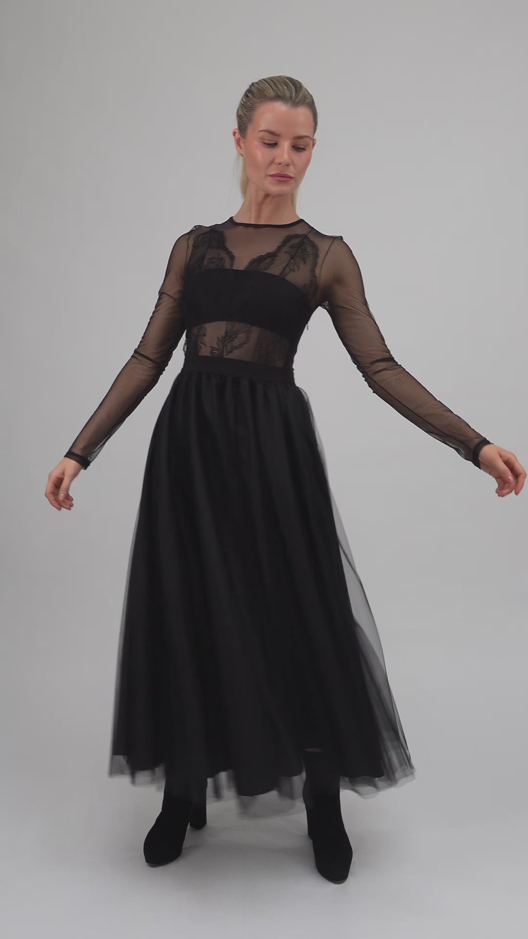 A stunning fusion of romance and modern femininity. This dress features a sheer tulle bodice with intricate embroidery, long fitted sleeves, and a softly structured waistband that flows into a full layered tulle skirt. The back reveals a semi-sheer panel for a subtle, elegant finish. Perfect for winter occasions, dinners, or evening events.