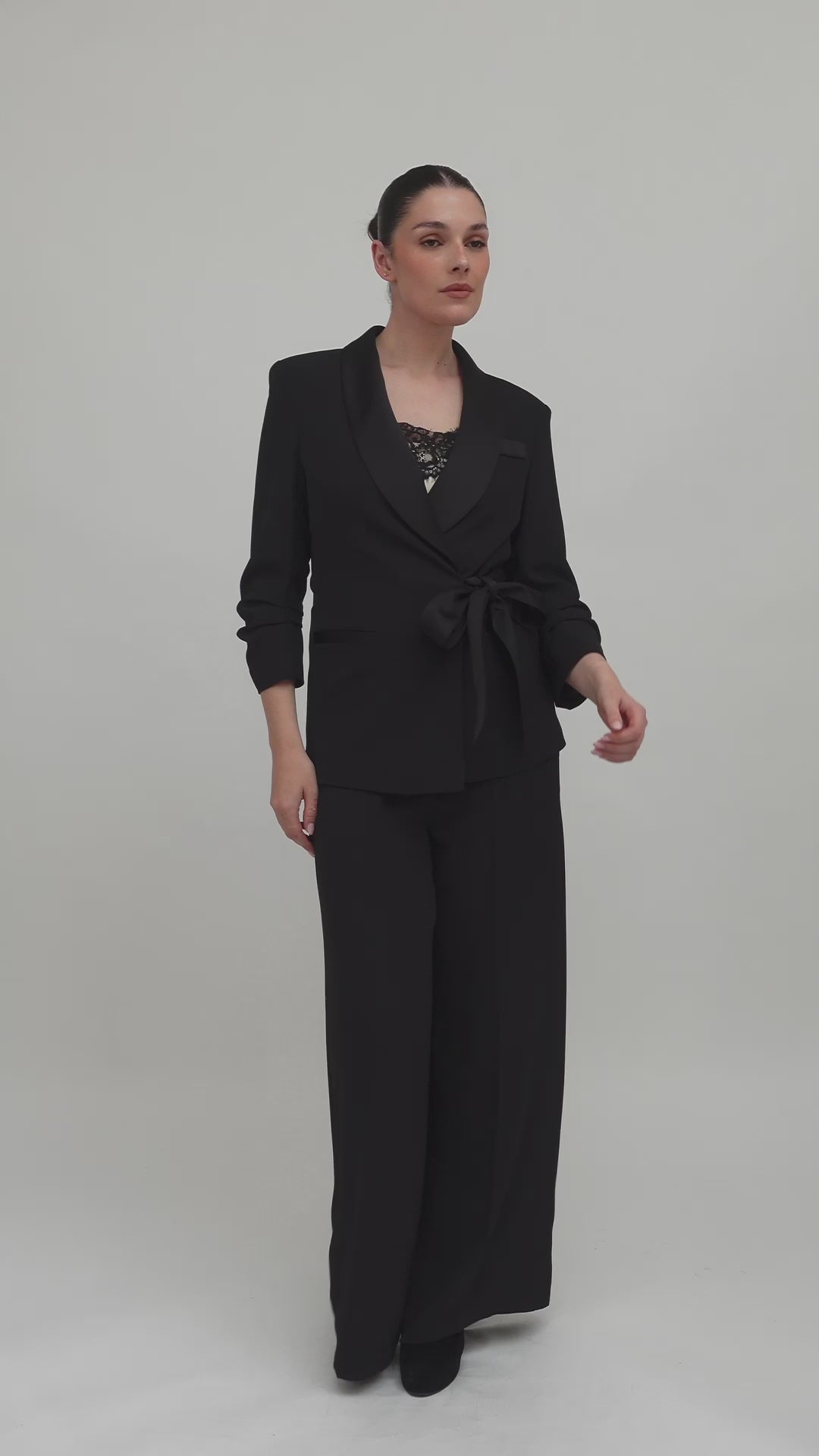 Fluid, elegant, and endlessly versatile. These high-waist palazzo pants are designed with a soft drape and wide leg for a flattering silhouette that moves with ease. Pair them with the matching tie-front blazer and lace cami for an elevated evening look.