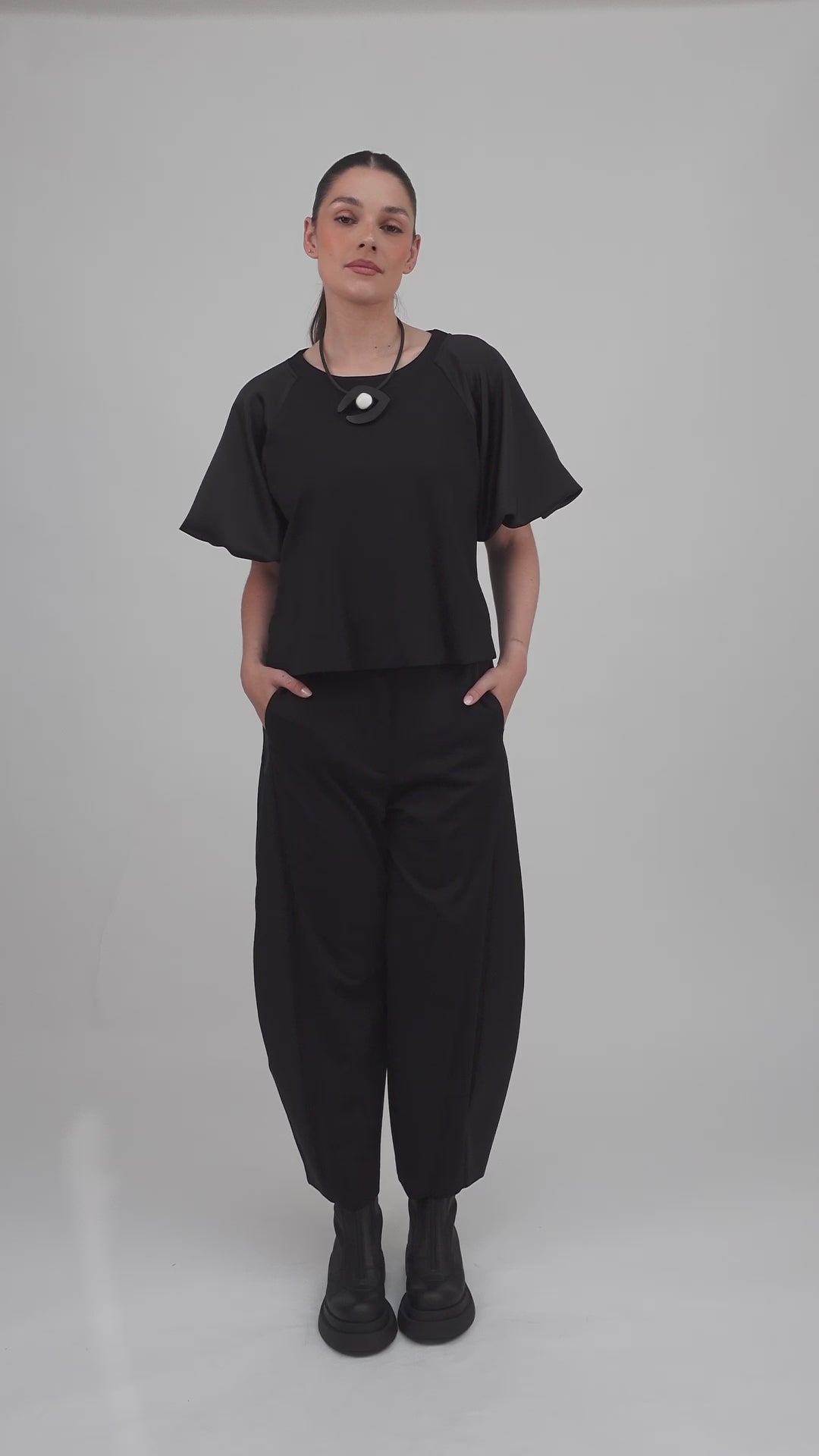 An elevated everyday piece with a sculpted silhouette. This short sleeve top features softly structured puff sleeves in a satin finish, balanced by a clean, minimalist body. Perfect for pairing with the matching barrel-leg travel trousers for a refined, modern look that transitions effortlessly from day to evening.