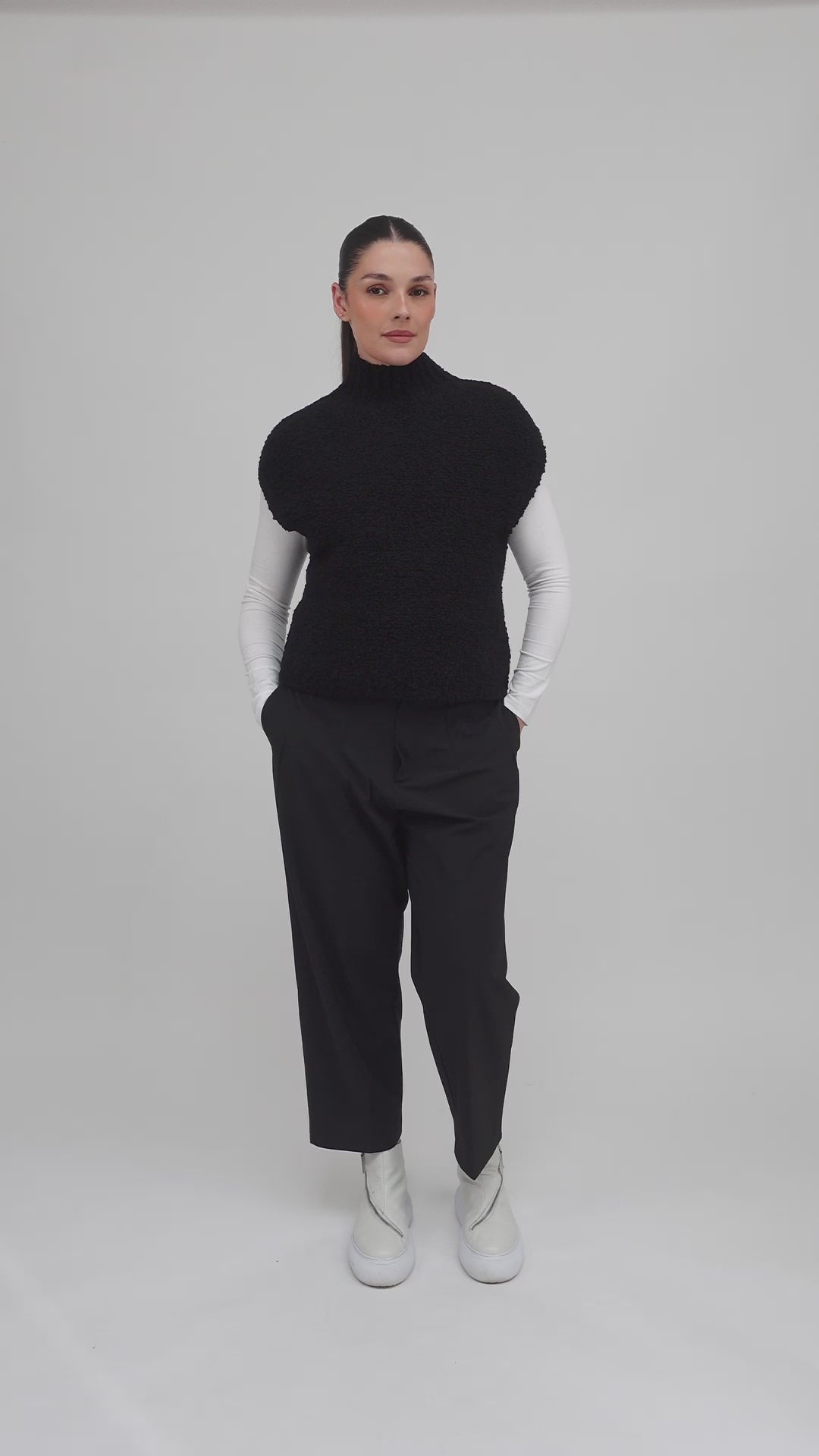 The Boucle Vest from Jane Lushka is a modern layering piece with a soft bouclé texture in versatile black.