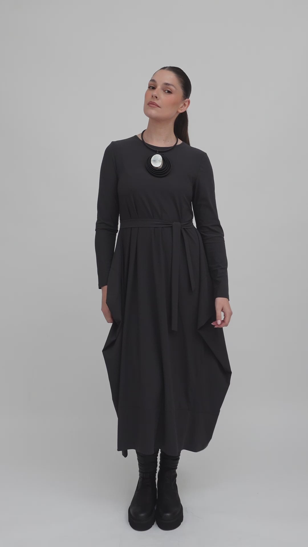 The Isabel Dress is an effortlessly chic piece designed for modern elegance. Made from soft technical jersey, it drapes beautifully while providing gentle stretch for comfortable movement. The long-sleeve design features a flowing A-line silhouette with distinctive side drapes, creating a refined and flattering shape. Ideal for both daywear and evening occasions, this dress pairs timeless simplicity with an artistic edge.